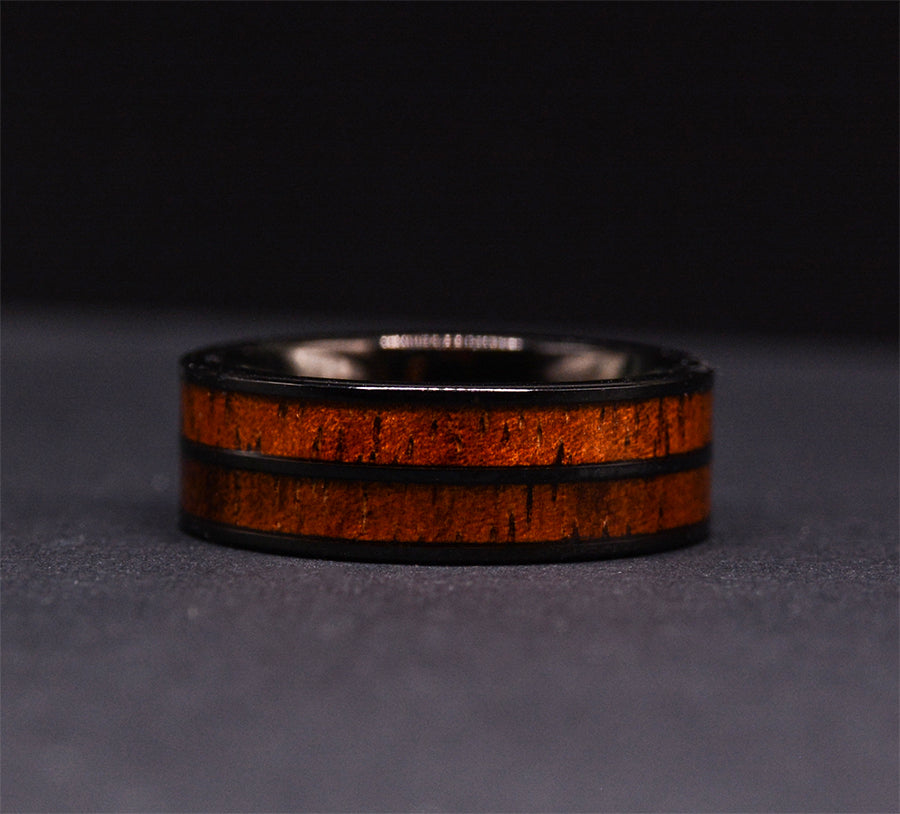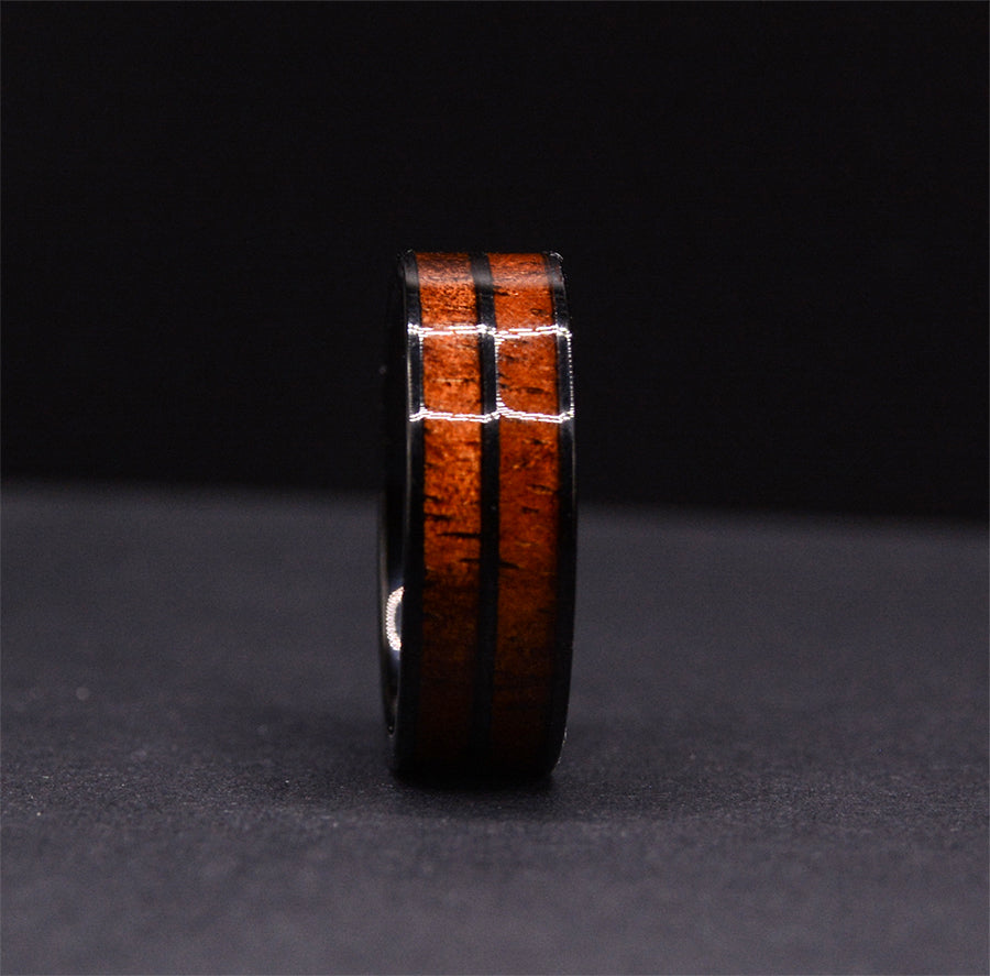 8mm two rows Koa wood tungsten wood inlay ring made of ultra hard tungsten and rare exotic Hawaiian koa wood. This tungsten carbide wedding band consists of 2 rows of koa wood separated by a center tungsten divider. This design brings together the most scratch resistant material and one of the rarest woods on earth; Hawaiian koa wood. The interior contains a smooth surface for the comfort of everyday wear.