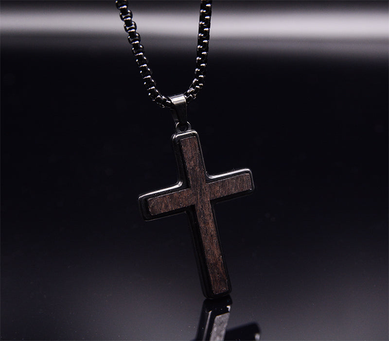 Black Stainless Steel Men's Cross Necklace with Ebony Wood Pendant