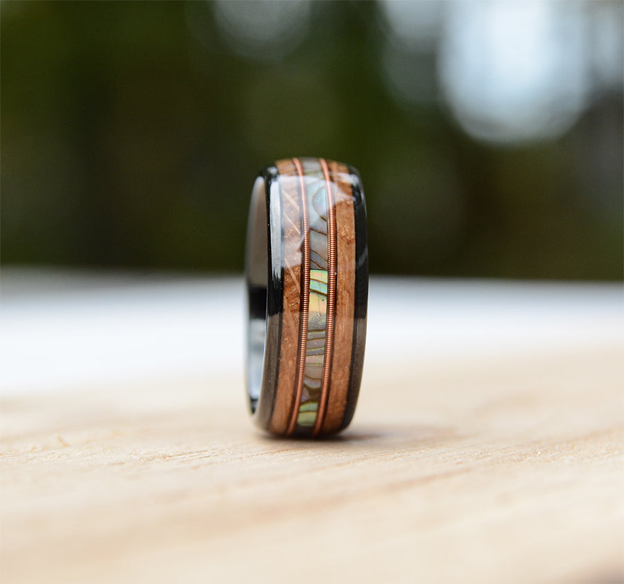 Abalone Shell and Wood Inlay Black Tungsten Wood Ring