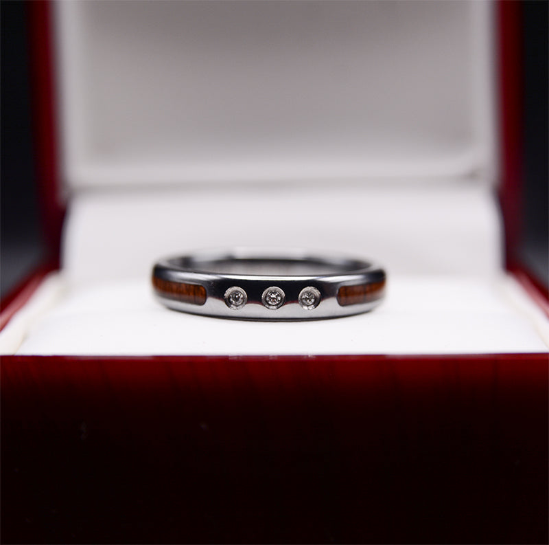 Elevate your love story with our exquisite Diamond Rings collection, featuring the stunning Wood Diamond Wedding Band with Koa Wood Inlay. Crafted with meticulous attention to detail, this 4mm width ring combines the timeless elegance of diamonds with the natural beauty of Koa wood.