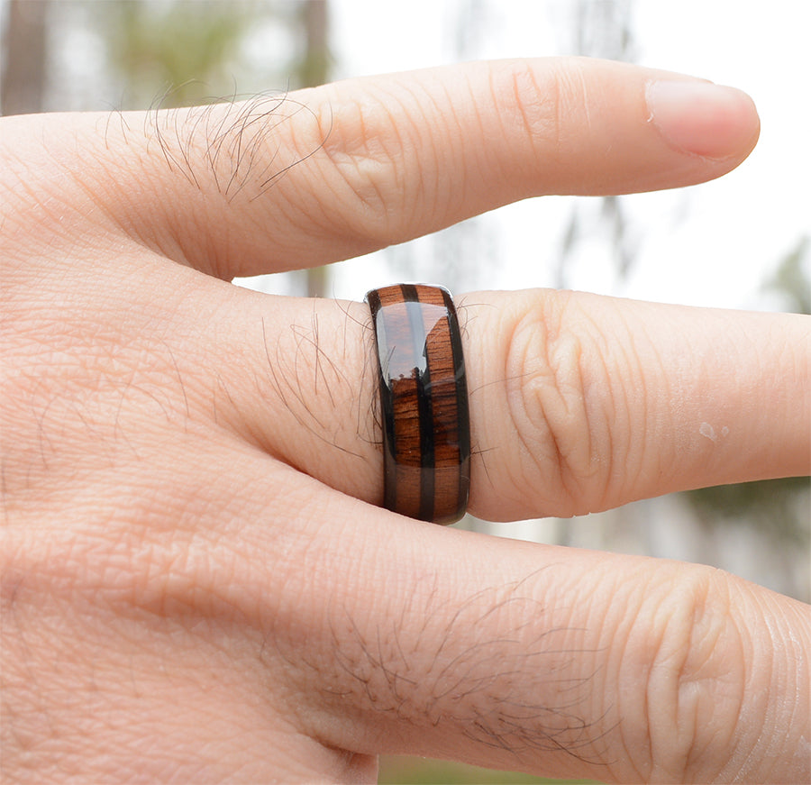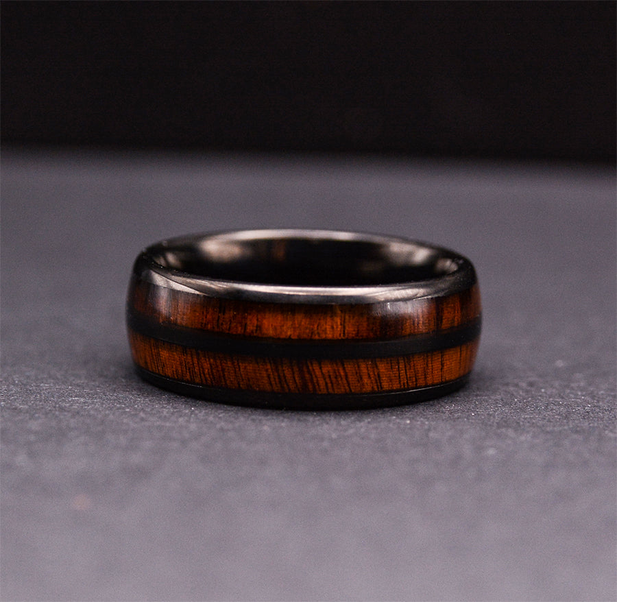 8mm two rows Koa wood tungsten wood inlay ring made of ultra hard tungsten and rare exotic Hawaiian koa wood. This tungsten carbide wedding band consists of 2 rows of koa wood separated by a center tungsten divider. This design brings together the most scratch resistant material and one of the rarest woods on earth; Hawaiian koa wood. The interior contains a smooth surface for the comfort of everyday wear.