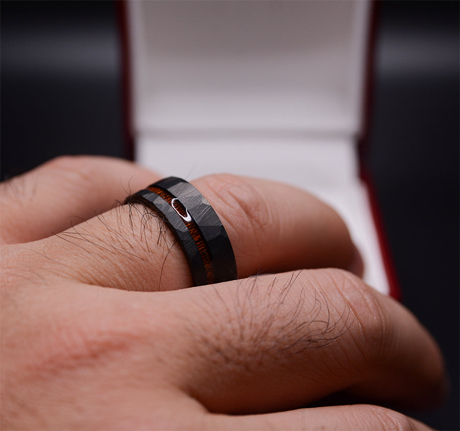 Hammered Texture Dark Tungsten Rings with Wood Inlay