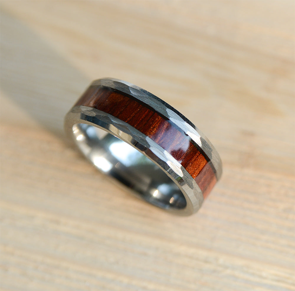 Beautiful diamond tungsten carbide ring sets with a classy Koa wood inlay and hammered texture. 3 small round diamonds with comfort fit band - slightly domed inner band. Made of superior quality tungsten carbide. Natural tungsten carbide in bright silver in color. Hypoallergenic, Cobalt-Free.