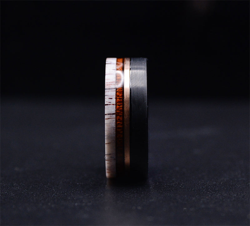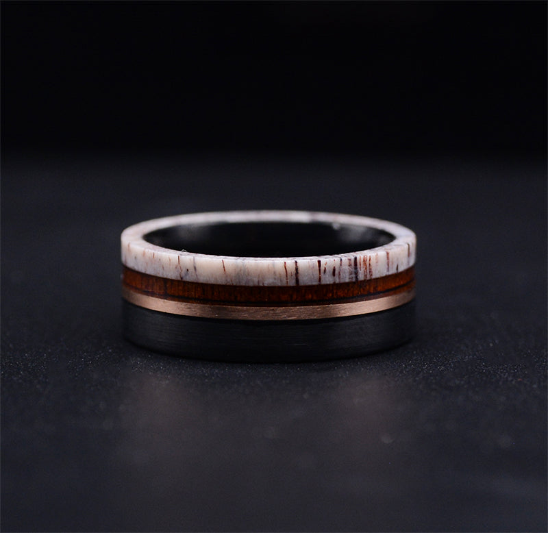 Unveil the perfect blend of style and strength with our Men's Tungsten Ring, showcasing a captivating Rose Gold Stripe, Antler, and Koa Wood Inlay. This wooden ring is a true masterpiece, reflecting the essence of nature and enduring love in a modern and sophisticated design.