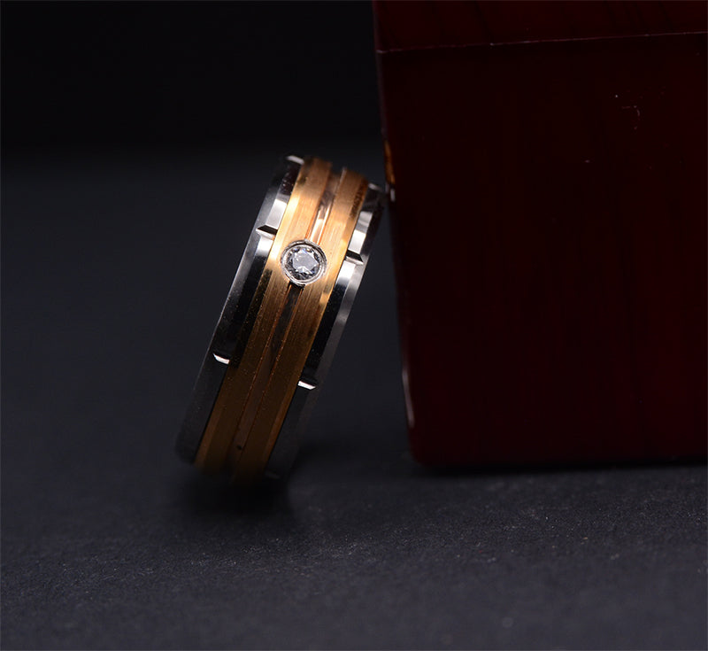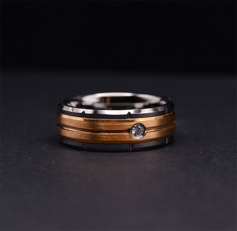 Our Modern Tungsten Wedding Ring for Men, featuring a diamond and gold stripes, is the epitome of elegance and strength. This ring is perfect for grooms seeking stylish and durable wedding rings for men. Hypoallergenic, Cobalt-Free.