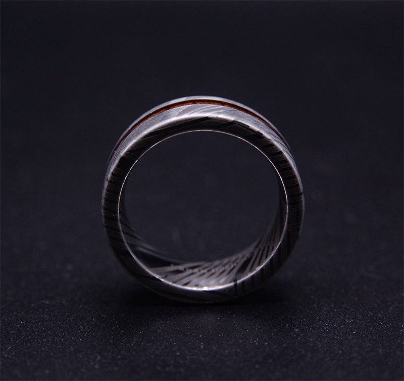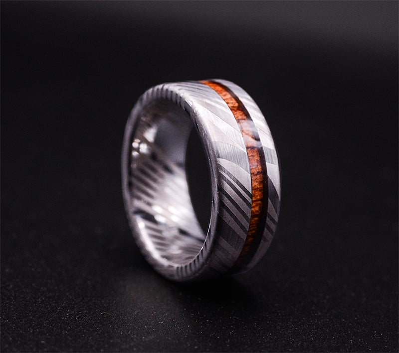 TimberForge Men's Wedding Band with Koa Wood Inlay and Damascus Steel