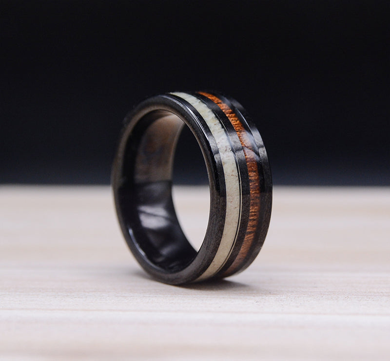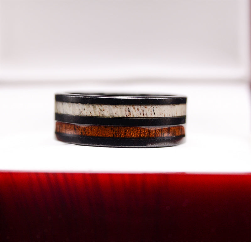 This gorgeous polished black flat band tungsten ring with beautiful deer antler by whiskey barrel koa wood inlays. Elegant and timeless.  This design brings together the most scratch resistant material and one of the rarest woods on earth.